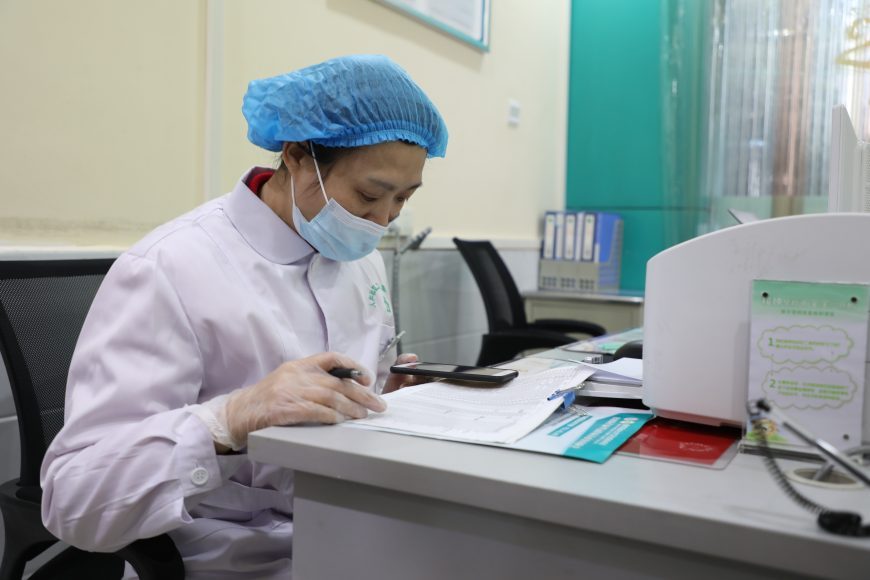 A nurse working in the community hospital and calling the residents for their travel information, photo by Zou Fei
