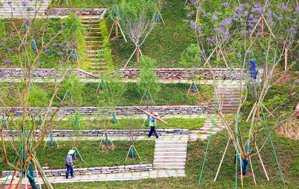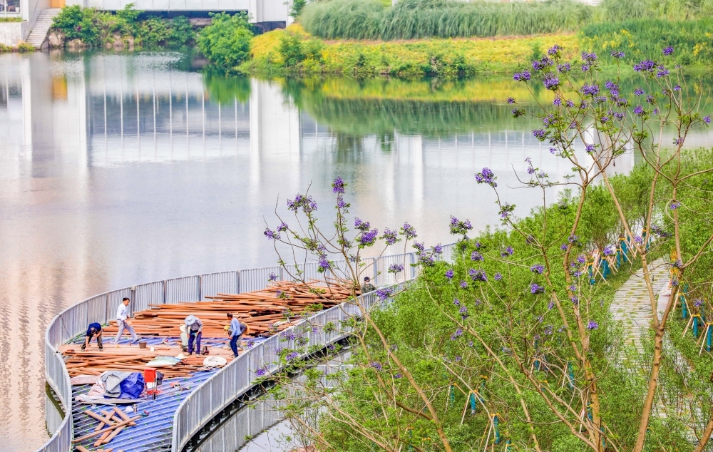 Workers were finishing the work by the side of Fengming Lake. (Photo/ Chongqing Hi-Tech Zone)