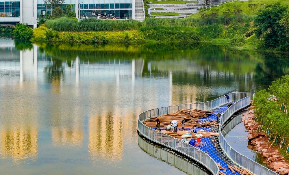Workers were working on the platform besides Fengming Lake. (Photo/ Chongqing Hi-Tech Zone)