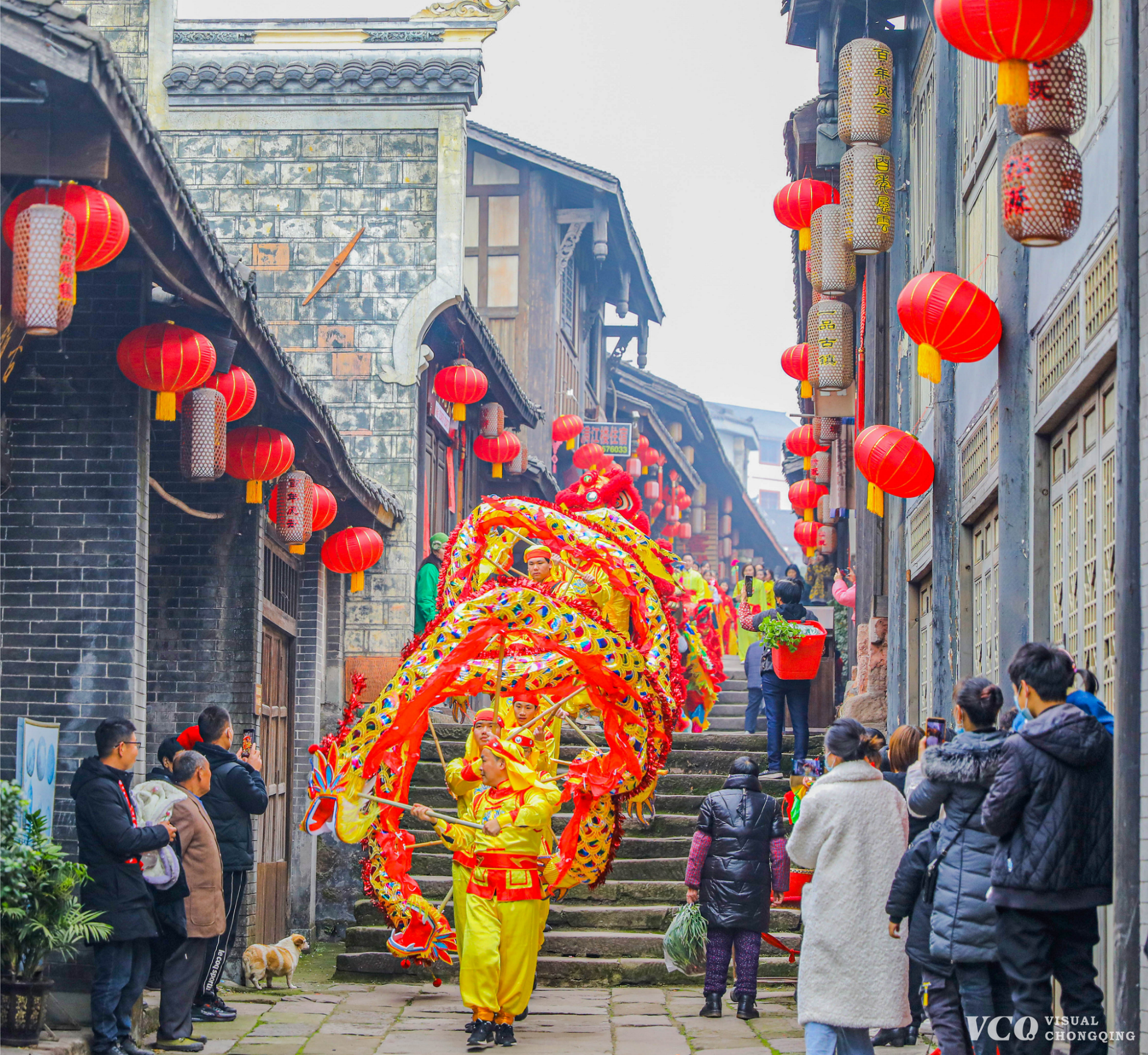 Dragon dances were performed in Songji Ancient Town of Yongchuan District with enthusiasm and progressiveness. Photo by Chen Keru/Visual Chongqing
