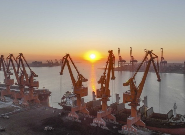 This aerial photo taken on Jan. 17, 2023 shows a morning view of Jingtang Port Area at Tangshan Port in Tangshan, north China's Hebei Province. (Photo/Liu Mancang, Xinhua)