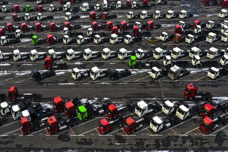 This aerial photo taken on Jan. 31, 2023 shows vehicles to be delivered at a parking lot of the FAW Jiefang in Changchun, northeast China's Jilin Province. (Photo/Xu Chang, Xinhua)