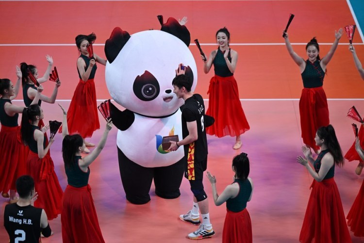 Li Yongzhen (C) of China celebrates his birthday after the men's volleyball bronze medal match against Iran at the Chengdu Universiade, August 7, 2023. (Photo/Xu Bingjie, Xinhua)