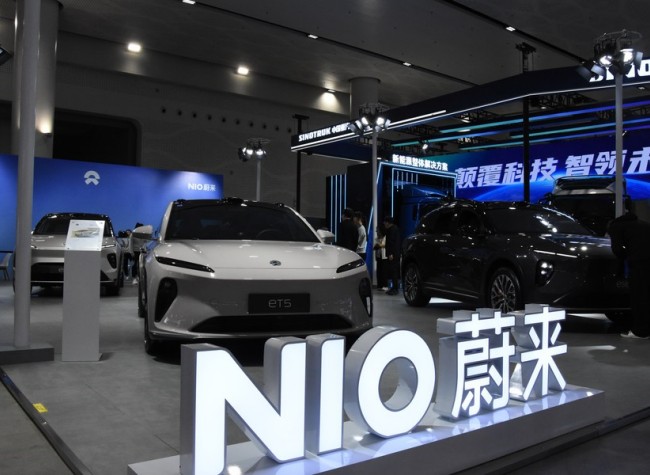 This photo shows vehicles of Chinese electric car manufacturer NIO displayed at the 2023 World New Energy Vehicle Congress in Haikou, south China's Hainan Province, Dec. 7, 2023. (Photo/Xinhua)