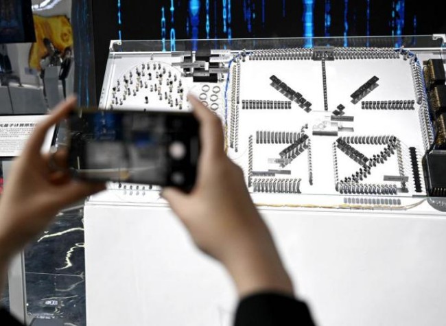 A visitor takes photos of a model of the quantum computing prototype "Jiuzhang" at the 2nd China (Anhui) Science and Technology Innovation Achievement Transformation Fair held in Hefei of east China's Anhui Province, April 26, 2023. (Photo/Xinhua)
