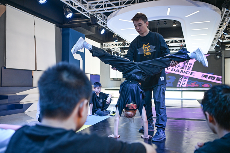 Wei Zhenyu (Rear, R), a coach at a street dance club, gives instructions to a student in Chengdu, southwest China's Sichuan Province, on July 16, 2024. (Photo/Wang Xi, Xinhua)
