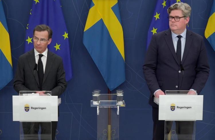 This is a screenshot captured from the video of the Swedish government's press conference held on the evening of Feb. 4, 2025. In the picture are Swedish Prime Minister Ulf Kristersson (left) and Minister of Justice Gunnar Strommer. (Photo/Xinhua)