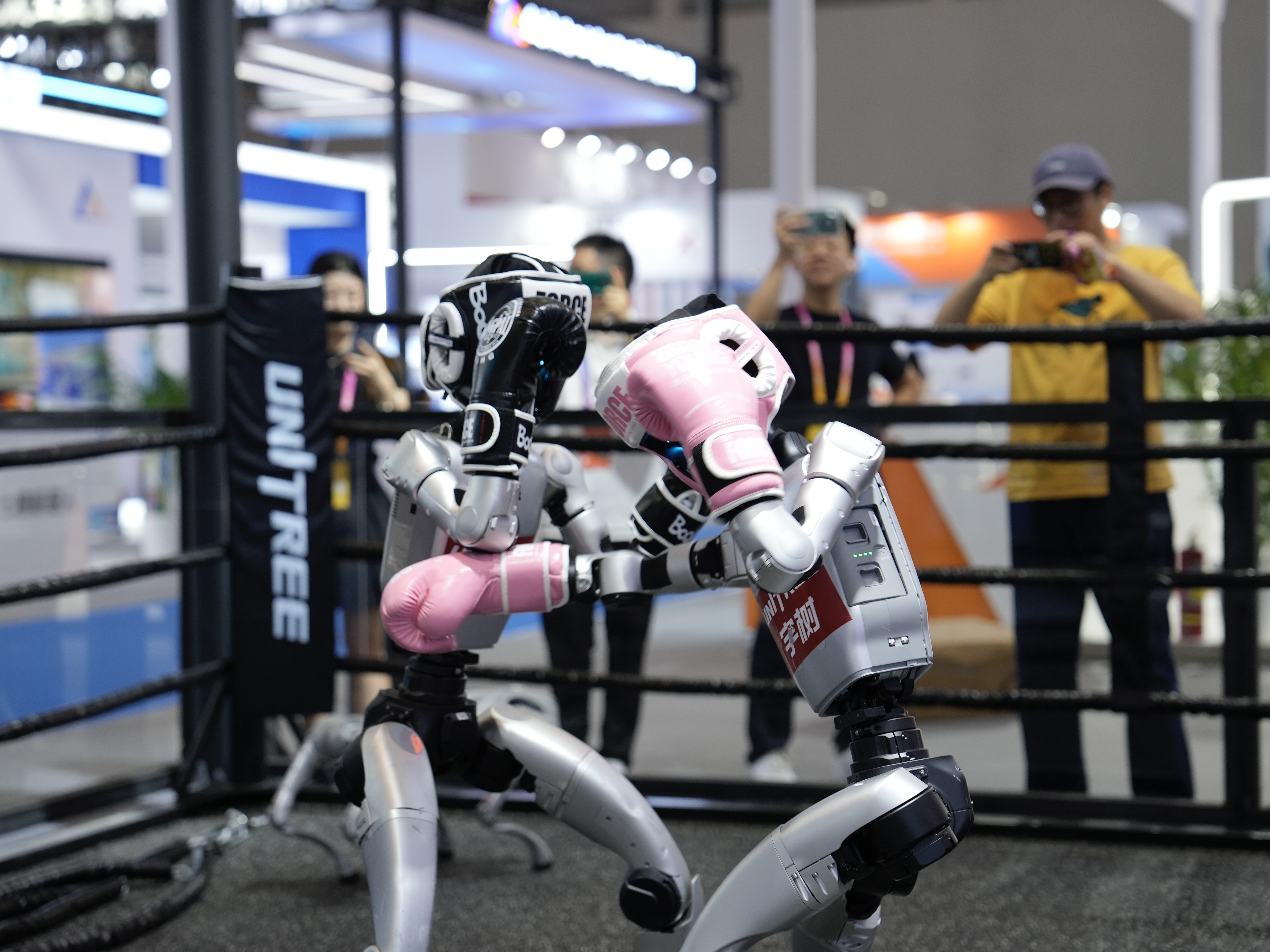 At the WSIE smart robot exhibition, Chinese company Unitree shows its humanoid robot in a boxing match. (Photo/Luo Huxin)