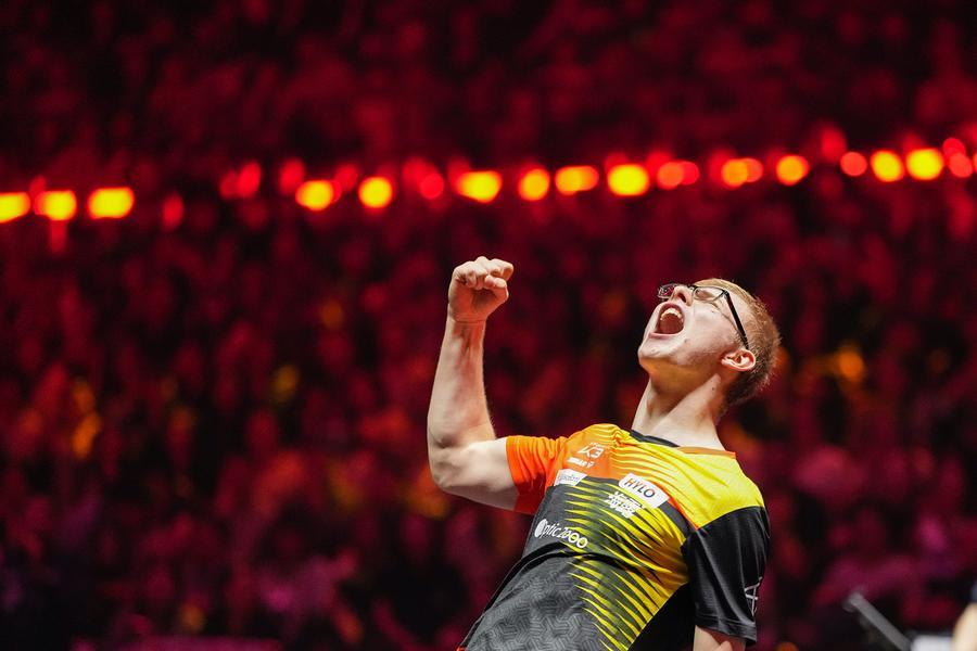 Felix Lebrun celebrates after winning the men's singles quarterfinal against Chen Junsong. (Xinhua/Ju Huanzong)
