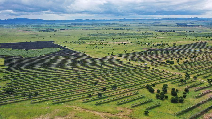 An aerial drone photo taken on July 29, 2025 shows photovoltaic panels at the site of a desertification control project integrated with wind and solar power facilities in Horqin Right Wing Middle Banner of Hinggan League, north China's Inner Mongolia Autonomous Region. (Photo/Xinhua)