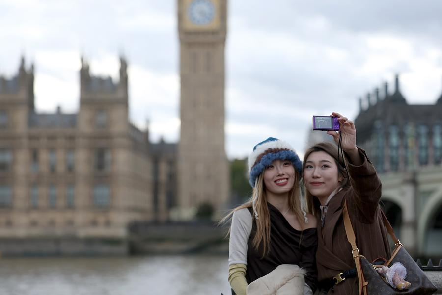 Two Chinese tourists take a selfie near the Big Ben in London, Britain, Oct. 5, 2025. (Photo/Li Ying)