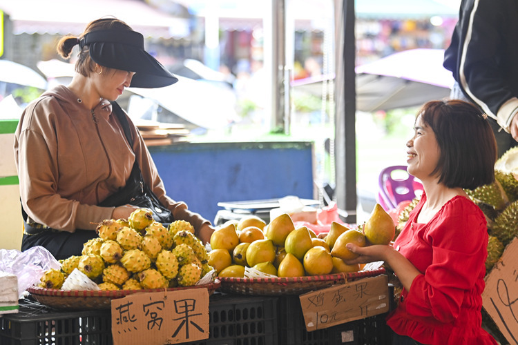 A customer purchases imported fruits at a market near the Dongxing port in Dongxing, south China's Guangxi Zhuang Autonomous Region, April 17, 2025. (Xinhua/Cao Yiming)