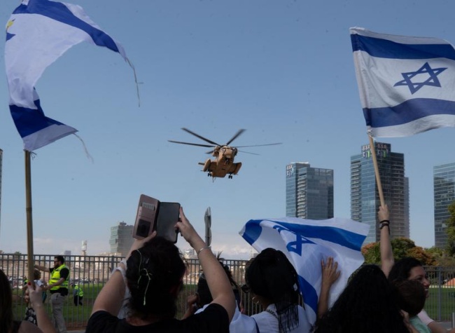 People celebrate as the helicopter carrying released hostages arrives at a hospital in Petah Tikva, Israel, Oct. 13, 2025. (Photo/Xinhua)