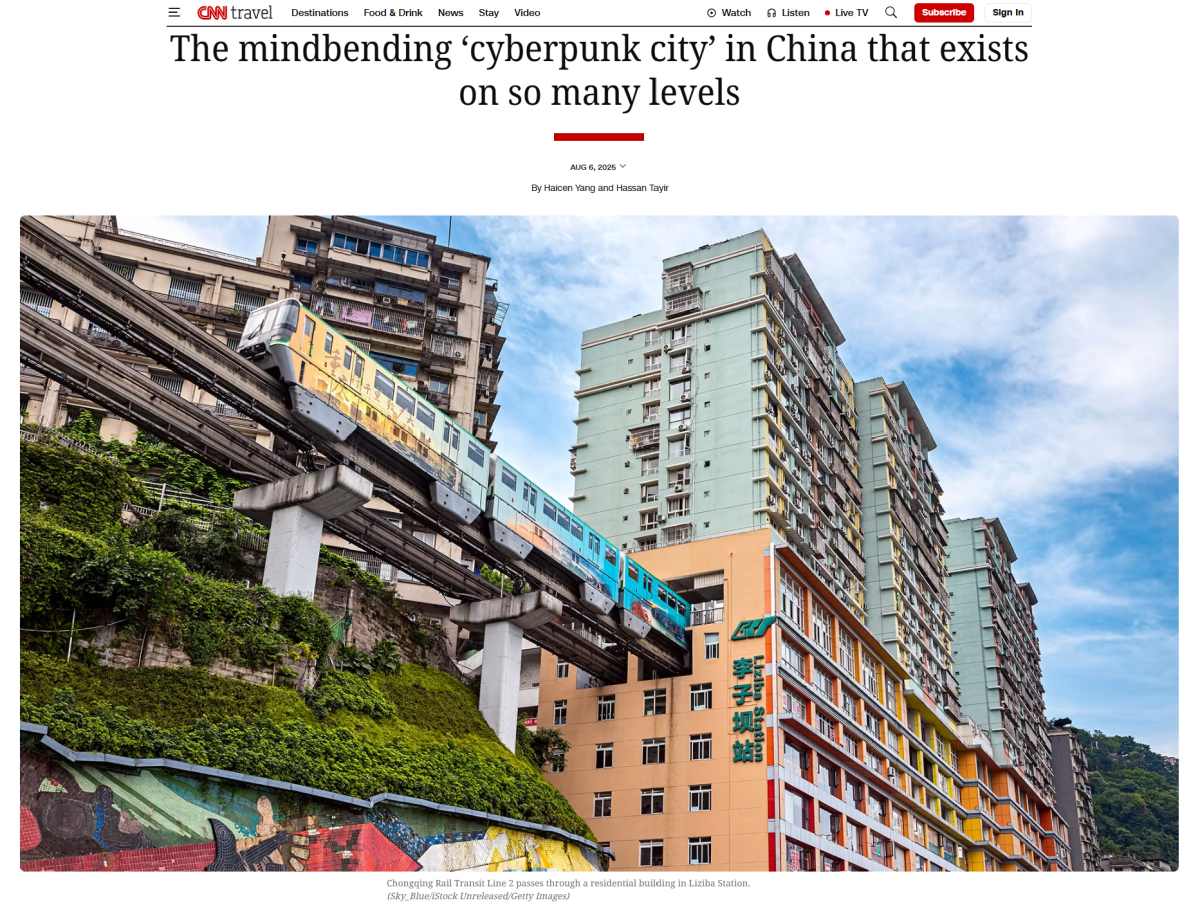 In August 2025, CNN published an article titled “The mindbending ‘cyberpunk city’ in China that exists on so many levels.” The piece spotlighted Chongqing’s layered transportation network and other unique urban features, which have captivated visitors and gone viral on social media. (Graphic/CNN)
