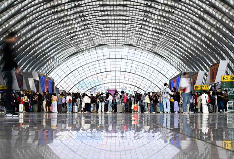 Passengers are pictured at the waiting hall of Tianjin West Railway Station in Tianjin, north China, Oct. 7, 2025. (Photo/Xinhua)