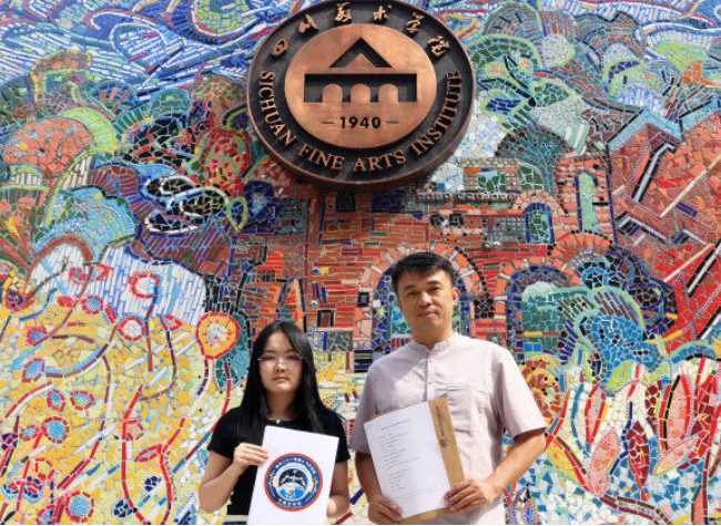 Designers of the Shenzhou-21 mission emblem, Dong Tian (left) and Gu Xin (right). (Photo/Sichuan Fine Arts Institute)