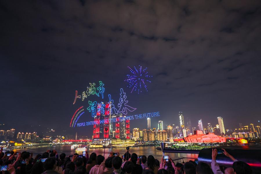 A grand drone light show themed on "People-Centered Smart Cities Towards the Future" was staged in Chongqing on October 27 as a special event for the 2025 World Cities Day China Observance. (Photo/Xinhua)