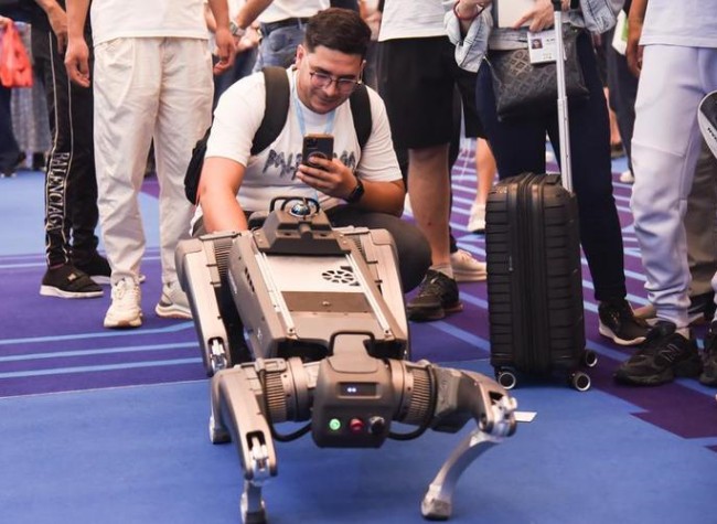 An overseas buyer takes photos of a robot dog during the 138th edition of the China Import and Export Fair, also known as the Canton Fair, in Guangzhou, south China's Guangdong Province, Oct. 16, 2025. (Photo/Xinhua)