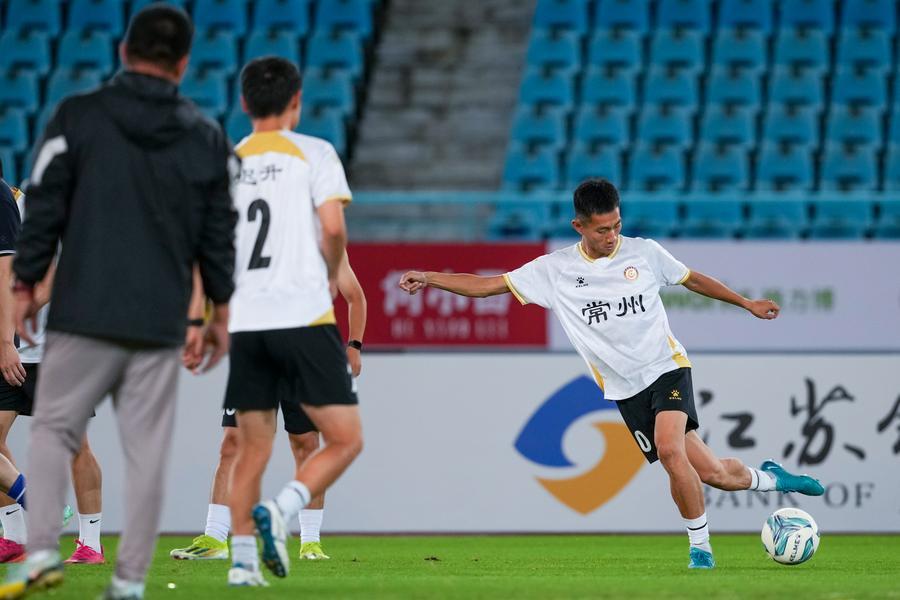 Lu Zhiyong (R) of Changzhou Team attends a training session one day ahead of the fifth round match against Nanjing Team at the 2025 Jiangsu Football City League in Changzhou, city of east China's Jiangsu Province, June 21, 2025. (Photo/Xinhua)