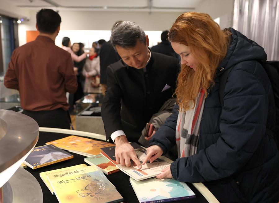 People visit the exhibition "Hanzi of the West, Letters of the East" in London, Britain, Nov. 22, 2025. A special event for an exhibition in London tracing the evolution of Chinese characters and their role in cultural exchange between China and the West kicked off Saturday at a gallery in London. (Photo/Xinhua)