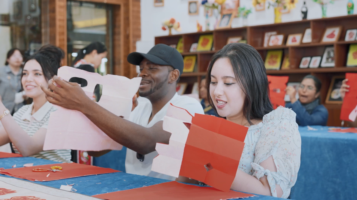 International guests are engaging in paper cutting of the character fu (good fortune). (Photo/Chen Junlin)