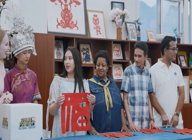 The exploration of living heritage continued at the Pengshui Vocational Education Center, an intangible cultural heritage inheritance and education base of Chongqing. Under the guidance, the global youths tried their hands at crafts, engaging in paper cutting of the character fu (meaning good fortune) and experimenting with wax batik to create patterns depicting symbols of the Miao ancestor Chiyou.