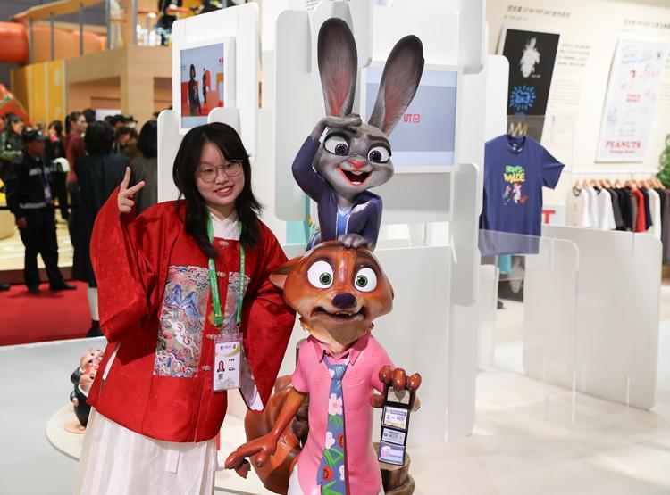 A visitor poses for photo at an exhibition area showcasing co-branded UT products of Uniqlo and "Zootopia" which made their debut during the 8th China International Import Expo (CIIE) in east China's Shanghai, Nov. 6, 2025. Many exhibitors debuted their latest products at the 8th CIIE in Shanghai. (Xinhua/Wang Jingqiang)