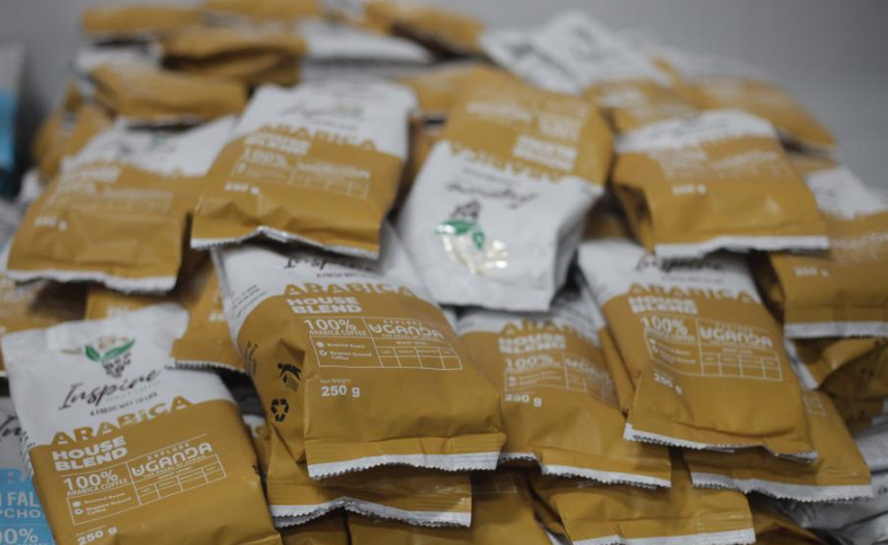This photo taken on Nov. 29, 2025 shows coffee packages at the African Coffee Park in western Uganda district of Ntungamo. (Photo/ Xinhua)