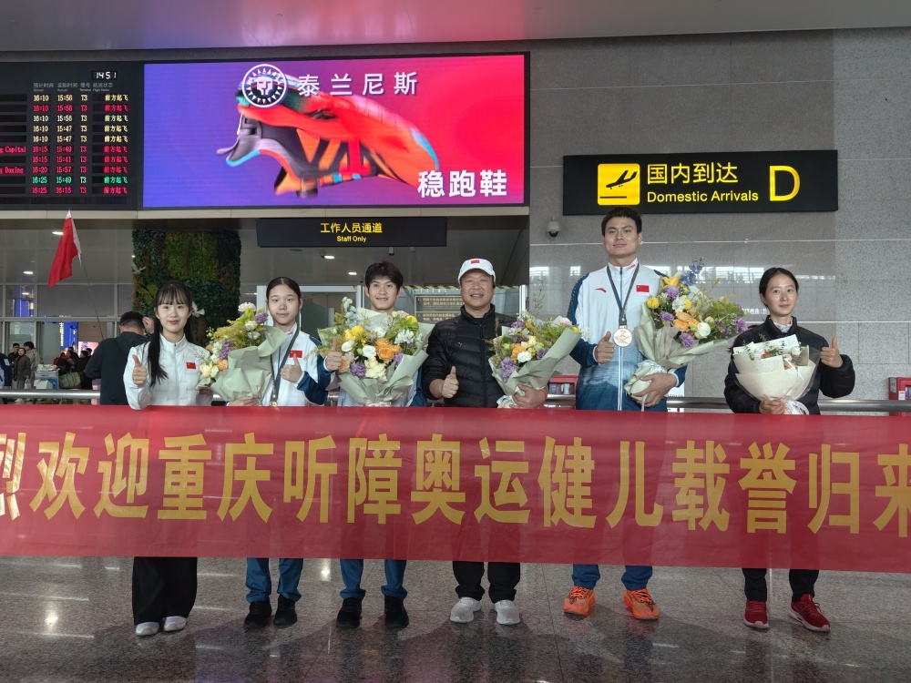 Chongqing athletes return from the Deaflympics. Li Kui is third from the left. (Photo/Chongqing Disabled Persons’ Federation)