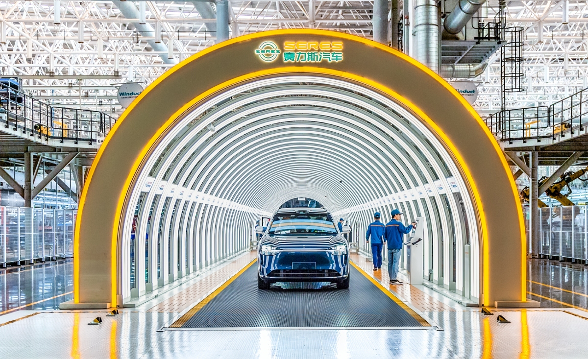 The Aito model, a car brand co-developed by Chongqing automaker Seres and Huawei, rolls off the production line. (Photo/Yan Yili)