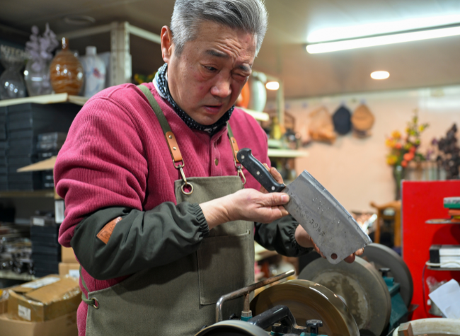 In Tianjin, China, a professional cutler is examining a knife in his shop. (Photo/Xinhua)