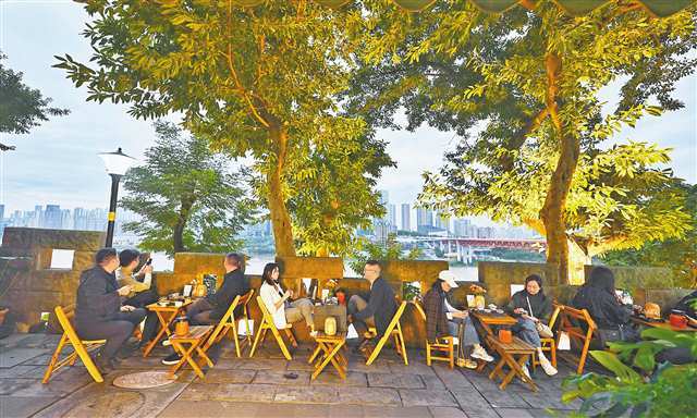 On October 21, visitors enjoy tea and conversation along the Daijia Alley cliffside walkway in Yuzhong District, Chongqing. (Photo/Long Fan, Visual Chongqing)