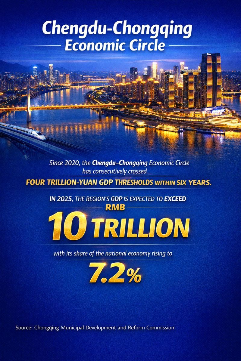 Gao added that the combined gross domestic product (GDP) of Chongqing and neighboring Sichuan province has climbed four trillion-yuan levels in six years and is expected to exceed 10 trillion yuan (about 1.43 trillion U.S. dollars) in 2025, accounting for about 7.2% of China's total economic output.