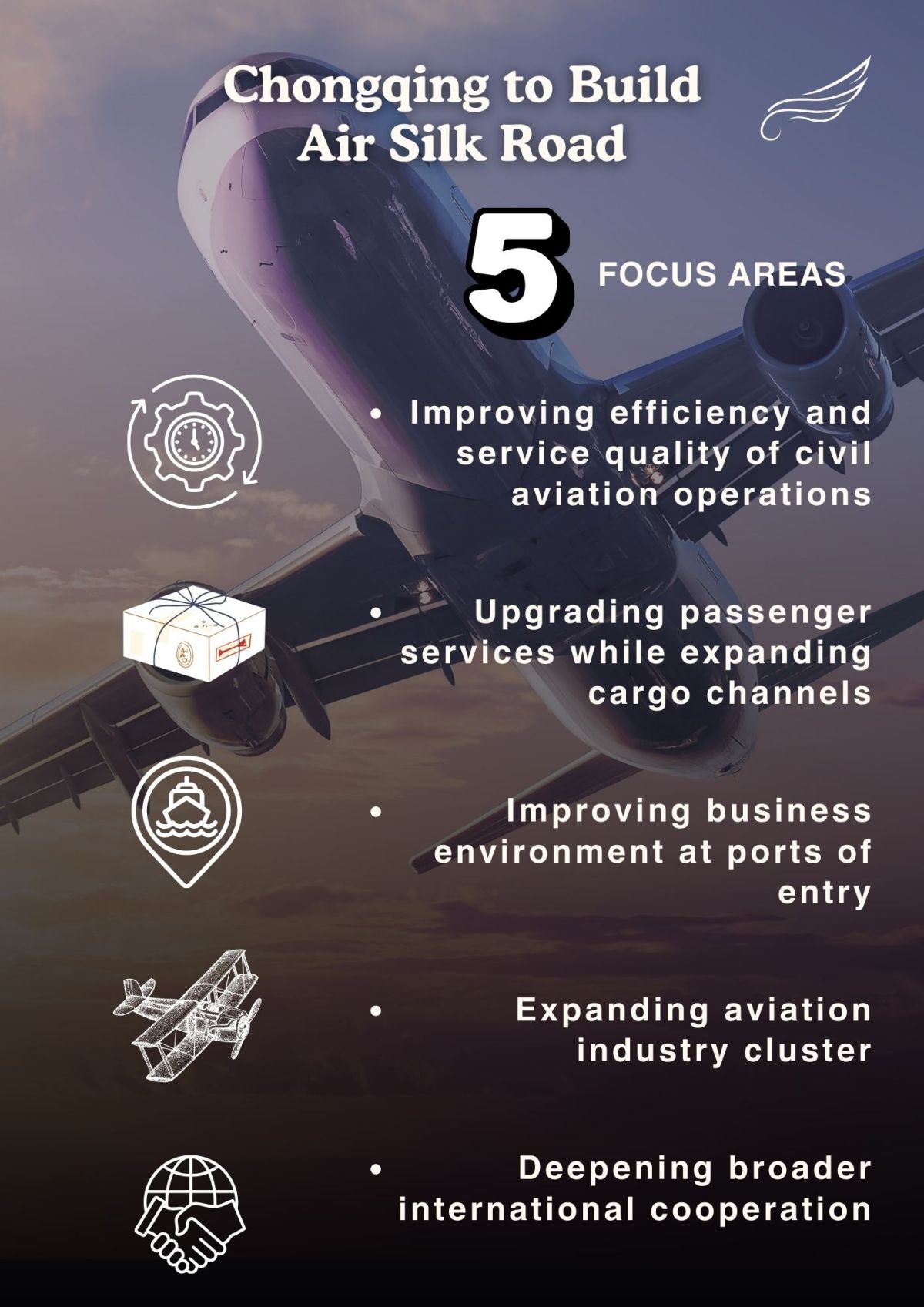 Chongqing has identified five focus areas for the expansion of the Air Silk Road. (Graphics/Chen Zhan)