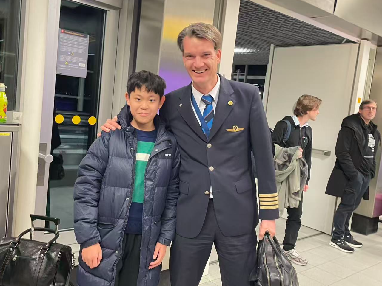 That was four months ago, when I was flying from Norway back to my home in China for summer vacation. I was also on a KLM flight, an A320neo. On the plane, seeing that I was a Chinese child, he was very kind to me. When the plane landed at Amsterdam Airport in the Netherlands, out of curiosity, I said I'd like to see what the cockpit looked like. The captain nodded right away and took me there. Inside, the dense array of large and small instruments and dials was dizzying to look at. I thought that being a pilot was really not easy! To seize this rare opportunity, I asked to take a photo with the captain and the co-pilot, and he agreed. I took out my phone, and with a "click," I captured that unforgettable moment.