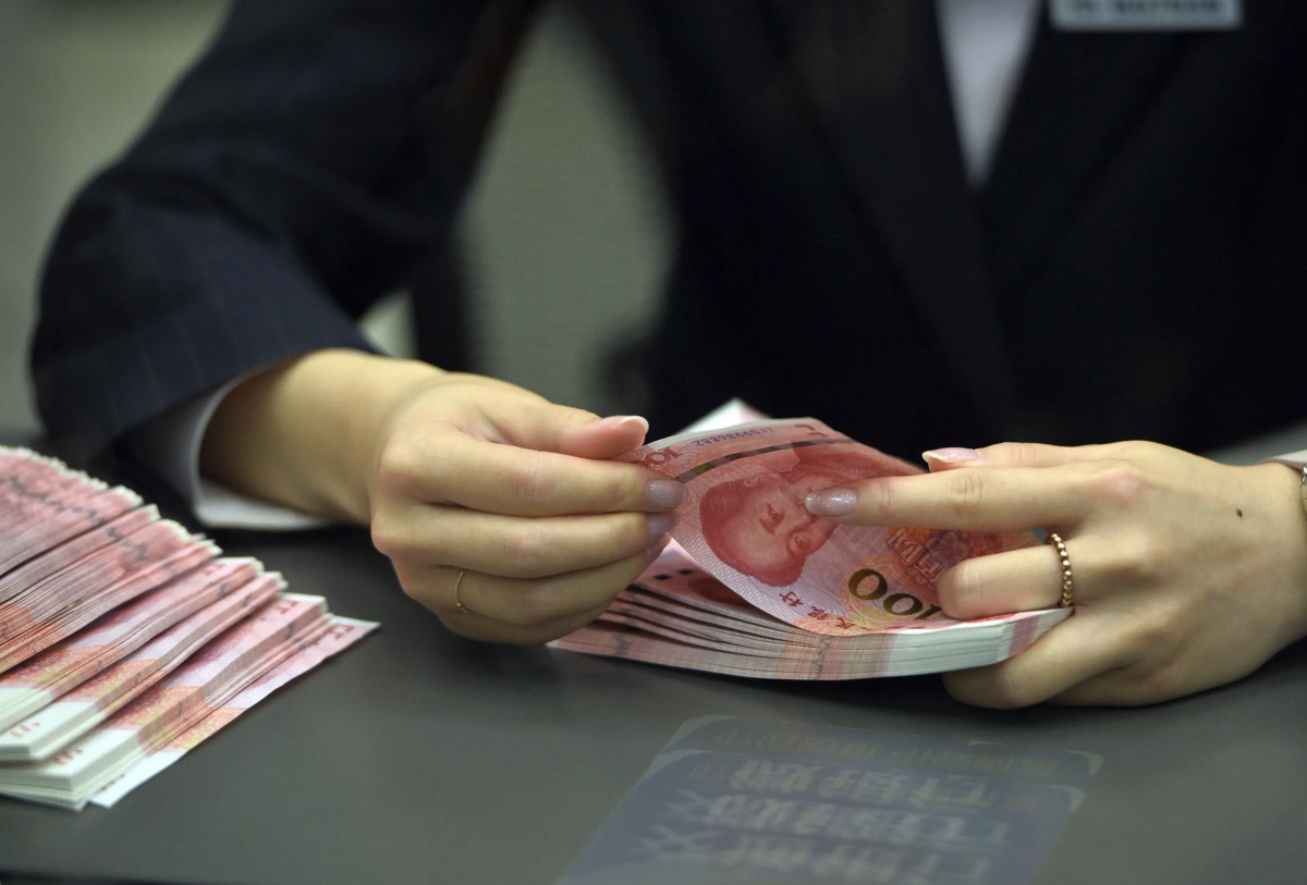 A bank worker is counting one-hundred-yuan bills. (Photo/Xinhua)