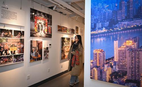 Visitor Yang Shirui views exhibits at the Chongqing Urban Renewal Photography Exhibition at Beicang Art Space in the Liangjiang New Area. (Photo/Zhang Jinhui)