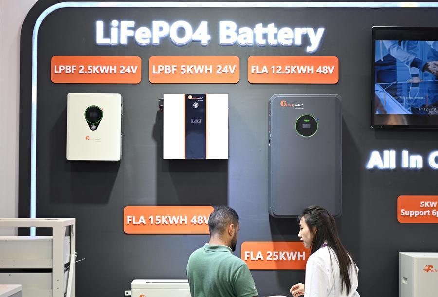 Energy storage exhibits are pictured during the 135th session of the China Import and Export Fair in Guangzhou, south China's Guangdong Province, April 15, 2024. (Photo/Xinhua)