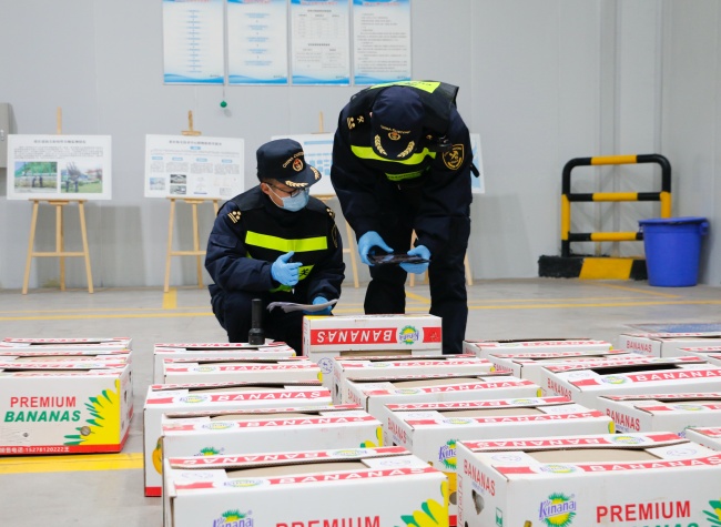 Customs officers at Chongqing Port inspect a shipment of imported bananas. (Photo/Chongqing Customs District)