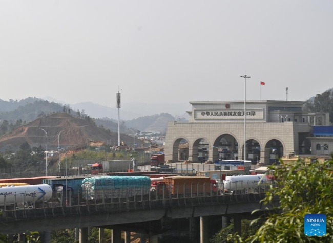 Vehicles wait to pass through Youyiguan Port, or Friendship Pass, in Pingxiang City, south China's Guangxi Zhuang Autonomous Region, Jan. 28, 2026. Youyiguan Port, China's main gateway to Vietnam, upgraded its border clearance system in January, significantly reducing customs clearance time and providing convenience for vehicles entering and exiting. (Photo/Xinhua)