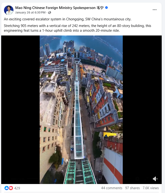 Screenshot of a Facebook post by China's Foreign Ministry spokesperson Mao Ning, sharing the 905-meter-long Shennü Escalator in Wushan, Chongqing.