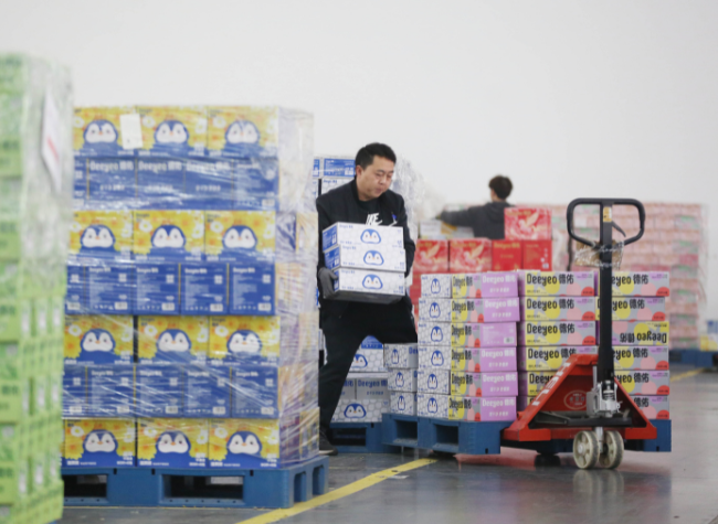 At a logistics center in Banan, Chongqing, warehouse workers are busy dispatching packages. (Photo/Chonqing Daily)