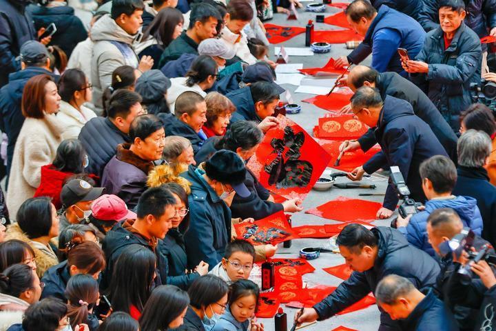 Artists write spring couplets and Chinese character "Fu," which means good fortunes, for citizens at a cultural center in Tianjin, north China, Jan. 22, 2026. (Photo by Du Penghui/Xinhua)