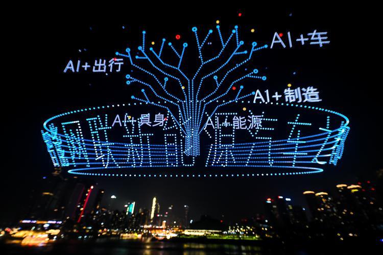 A nighttime drone light show in Chongqing formed Afari Technology’s logo above the city skyline. (Photo/Afari Technology)
