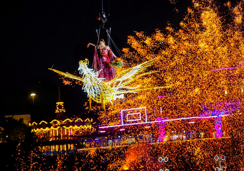 At Chongqing Happy Valley, a theme park loved by young visitors, the folk performance "Datiehua"- molten iron thrown into the air to create showers of sparks- has been combined with aerial stunts and water-based dragon boat performances.