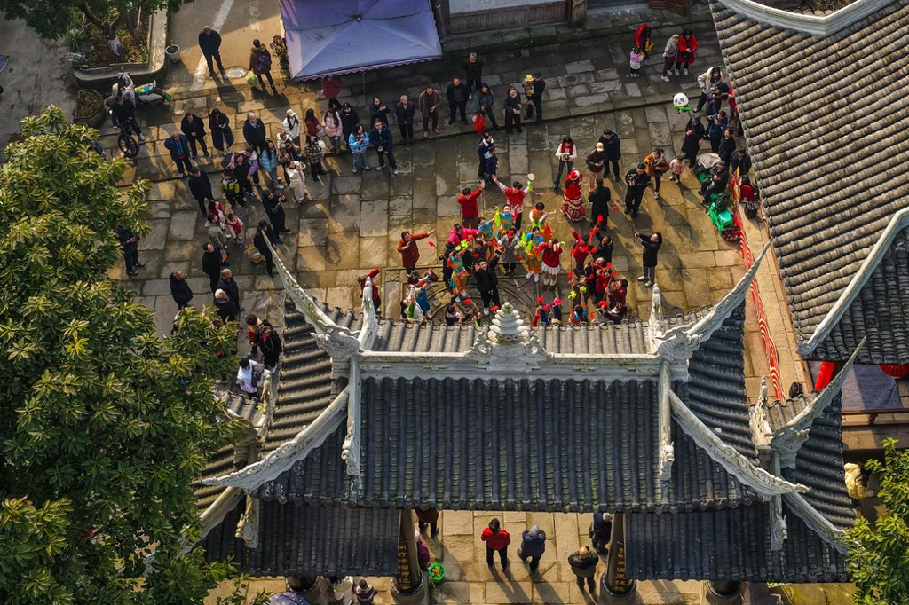 At Longxing Ancient Town in Chongqing Liangjiang New Area, a Spring Festival program opened on February 13. On the stone-paved streets, performers dressed in traditional opera costumes interact with visitors and stage folk dances such as the Lianxiao dance, in which two or more dancers rhythmically tap their backs, shoulders, arms and legs with sticks while singing and jumping.