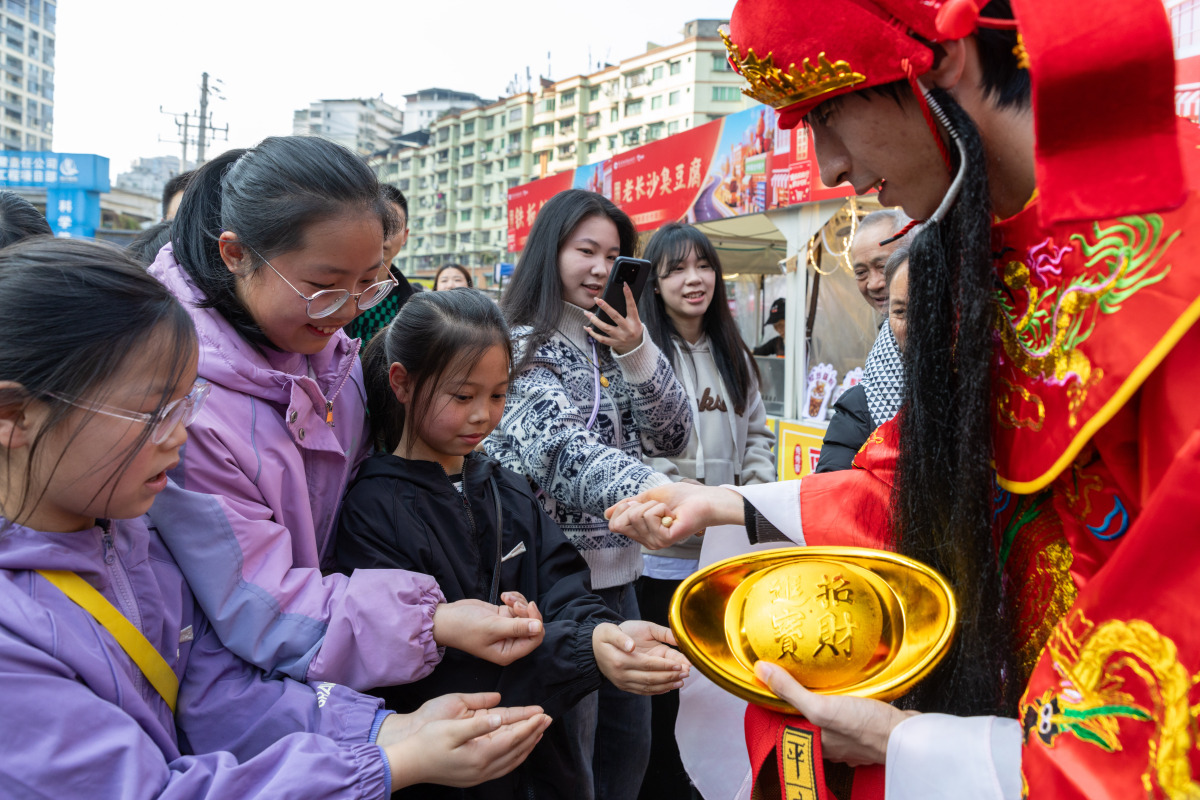 On Feb. 21 in Nanchuan, Chongqing, a performer dressed as the God of Wealth mascot interacts with children. (Photo/Chongqing Daily)