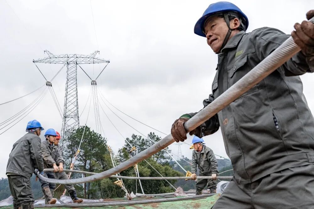 On January 8, 2025, workers from Chongqing Electric Power Transmission and Transformation Company install the final section of conductor for the Chongqing segment of the Hami–Chongqing ±800 kV UHVDC transmission project, part of the Xinjiang–Chongqing power transmission project. (Photo/Zhang Jinhui)