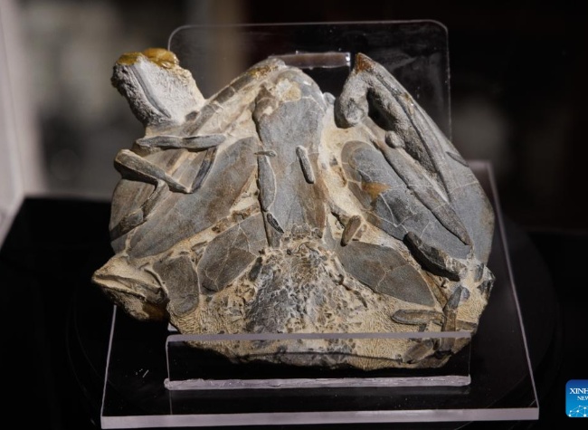 This photo taken on March 3, 2026 shows the fossil of Eosteus chongqingensis at the Institute of Vertebrate Paleontology and Paleoanthropology (IVPP) of the Chinese Academy of Sciences (CAS), in Beijing, capital of China. Fossils of two fish from over 400 million years ago -- one a tiny streamlined creature, the other a giant among vertebrates of its time with bizarre teeth -- have been discovered in China, filling a critical gap in the evolutionary journey "from fish to human." (Xinhua/Jin Liwang)