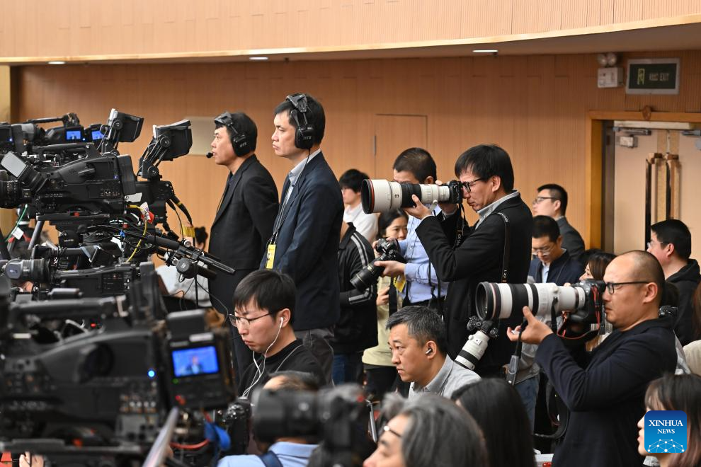 Journalists work at a press conference for the fourth session of the 14th National People's Congress (NPC) on people's livelihood in Beijing, capital of China, March 7, 2026. (Photo/Xinhua)